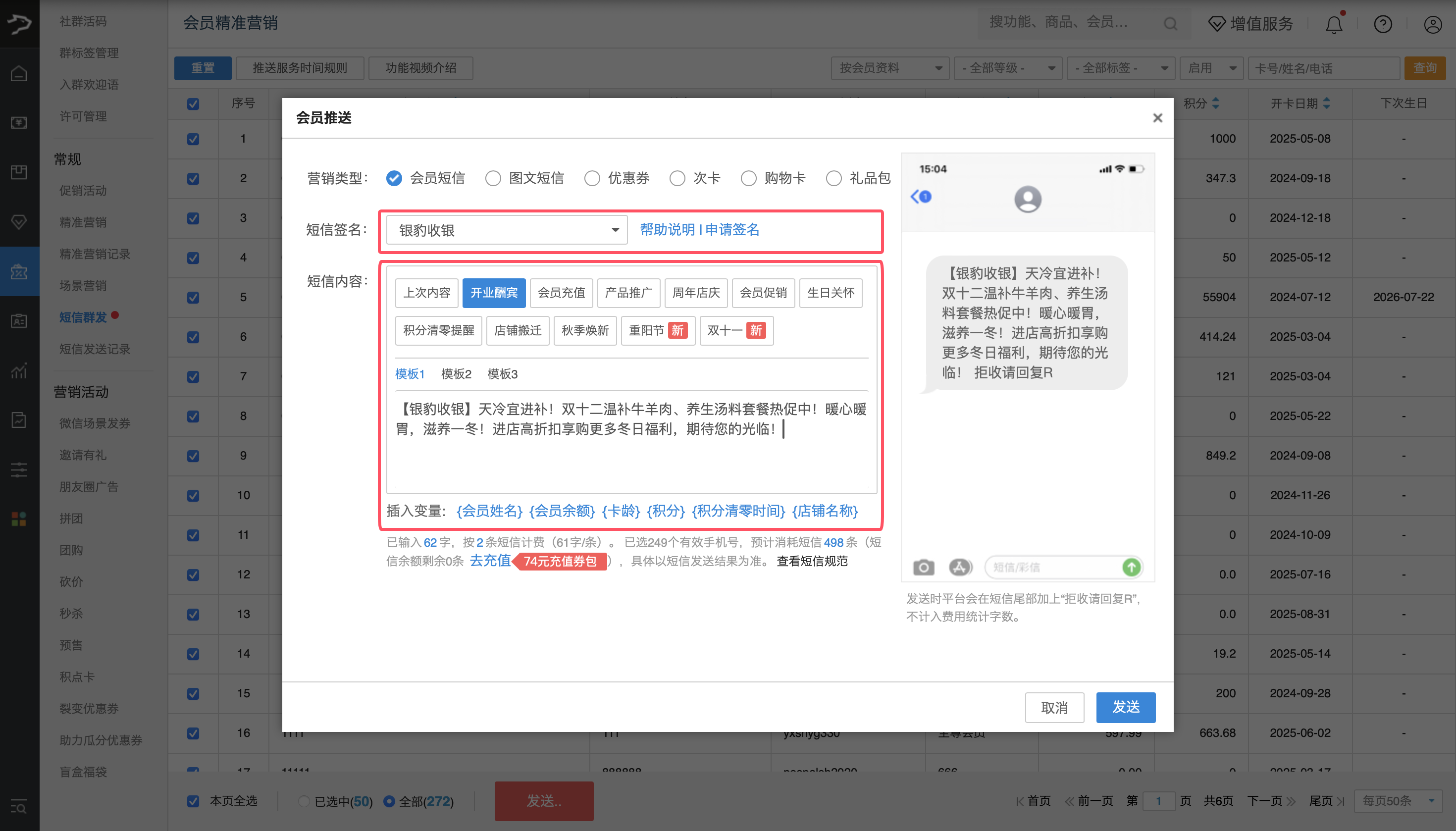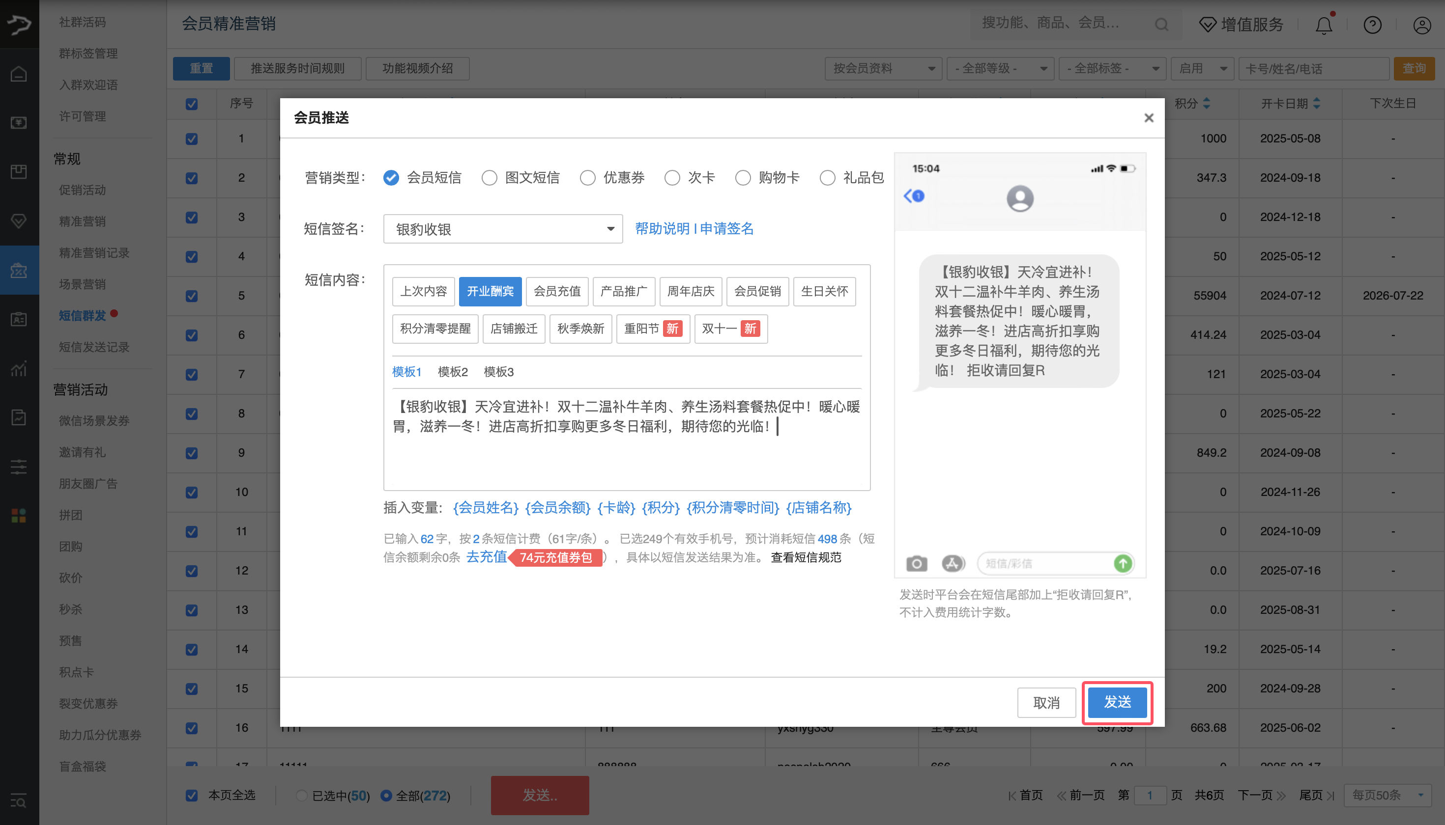 ① 选择要发送短信的会员群体,点击【发送】按键。